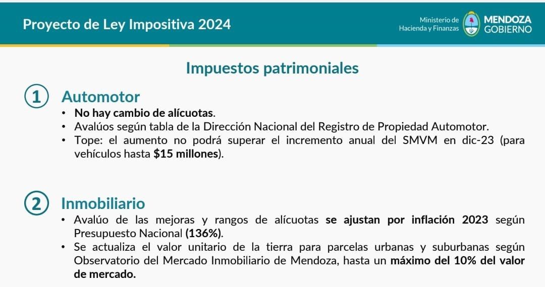 En relación con el Impuesto Inmobiliario, el avalúo de las construcciones se adecúa según inflación proyectada 2023 del proyecto de presupuesto del Gobierno Nacional. Para la determinación del valor de la tierra urbana y suburbana en 2024 se utilizarán métodos de valuación masiva surgidos del Observatorio del Mercado Inmobiliario de Mendoza desarrollado en el ámbito de la Dirección de Catastro.