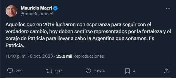 "Aquellos que en 2019 lucharon con esperanza para seguir con el verdadero cambio, hoy deben sentirse representados por la fortaleza y el coraje de Patricia para llevar a cabo la Argentina que soñamos. Es Patricia", posteó el expresidente Mauricio Macri, al término del debate.