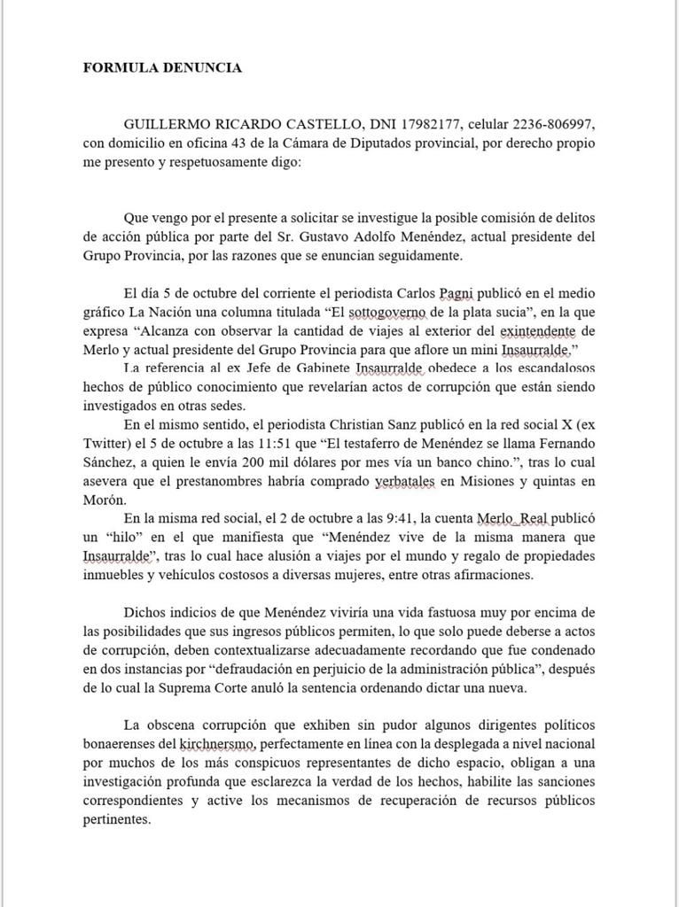 La denuncia del legislador libertario se basó en publicaciones periodísticas que dan cuenta de la vida ostentosa de Menéndez, al que lo califican de ser un “mini Insaurralde” por sus viajes por el mundo y regalos de propiedades y autos a diferentes mujeres; además de nombrar a quien sería su testaferro, que recibiría de Menéndez la suma de 200 mil dólares mensuales.