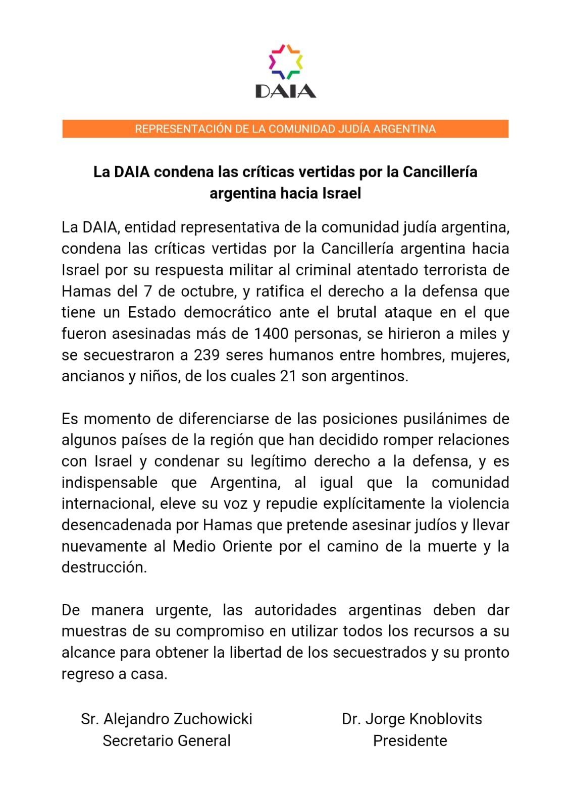 El comunicado titulado como "la DAIA condena las críticas vertidas por la Cancillería argentina hacia Israel", expresa que la entidad "condena las críticas vertidas por la Cancillería argentina hacia Israel por su respuesta militar al criminal atentado terrorista de Hamás del 7 de octubre, y ratifica el derecho a la defensa que tiene un Estado democrático ante el brutal ataque en el que fueron asesinadas más de 1400 personas, se hirieron a miles y se secuestraron a 239 seres humanos entre hombres, mujeres, ancianos y niños, de los cuales 21 son argentinos".