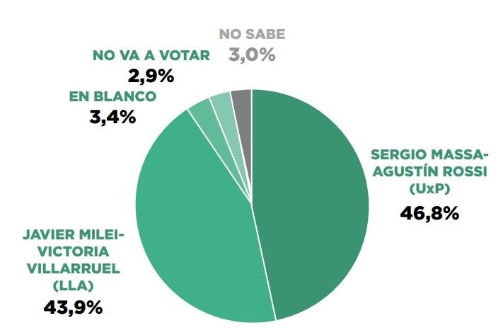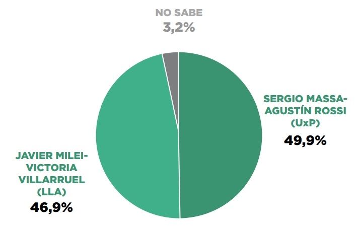 El segundo ítem muestra también una diferencia de tres puntos para el candidato de Unión por la Patria quien se llevaría la elección con el 49,9% de los votos sobre el 46,9% del libertario. El voto indeciso es del 3,2%.