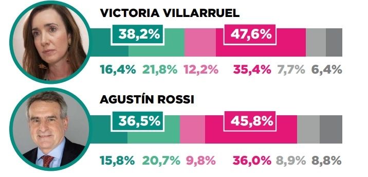 En tanto, la consultora también midió la imagen de los compañeros de fórmula de Sergio Massa y Javier Milei. Allí, Victoria Villarruel se impone en los dos ítems con un positivo de 38,2% y un negativo del 47,6%. En tanto que Agustín Rossi tiene una imagen positiva de 36,5% y un negativo del 45,8%.