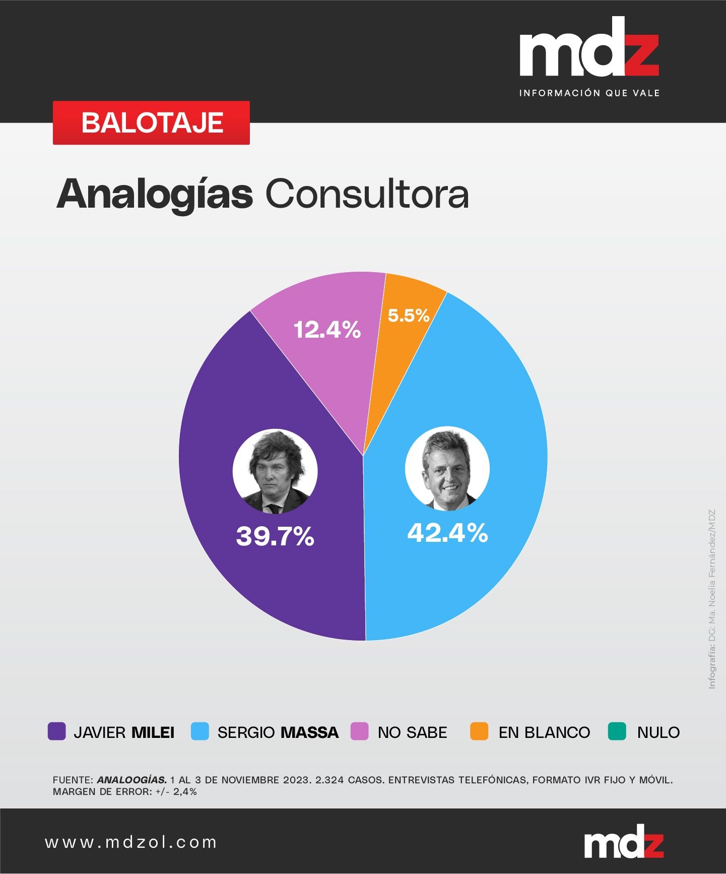 La encuestadora que vaticinó en octubre que Sergio Massa ganaría en la elección general, reveló que en el próximo balotaje será el candidato libertario quien gane en el balotaje con un total de 52,1% de votos, mientras que el candidato de Unión por la Patria recaudaría un total de 47,9%. Los votos en blanco serían de 2,8%, los nulos 1,6% y un 2,3% de indecisos. esta encuesta se publicó este viernes a pocas horas del comienzo de la veda.