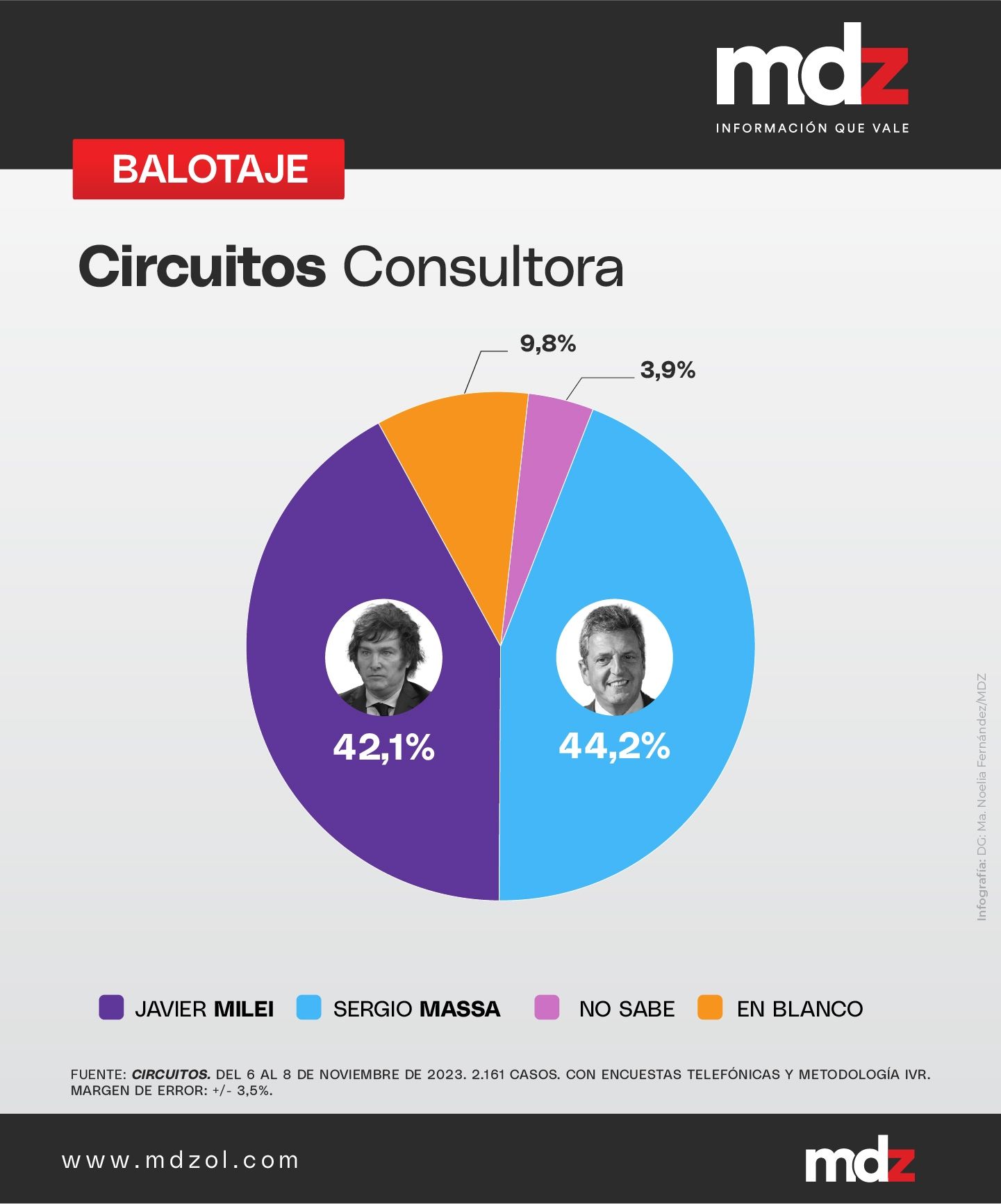 El 44,2% de los votos irían para el ministro de Economía según el sondeo que investigó Circuitos. Milei, en tanto, obtendría el 42,1% de los sufragios. El 9,8% votaría en blanco o nulo, mientras que el 3,9% aún está indeciso. El 29% de los encuestados asocia la motosierra del diputado con la palabra "ajuste", mientras que el 42,9% relaciona el concepto de "unidad nacional" de Massa con "reconstrucción".