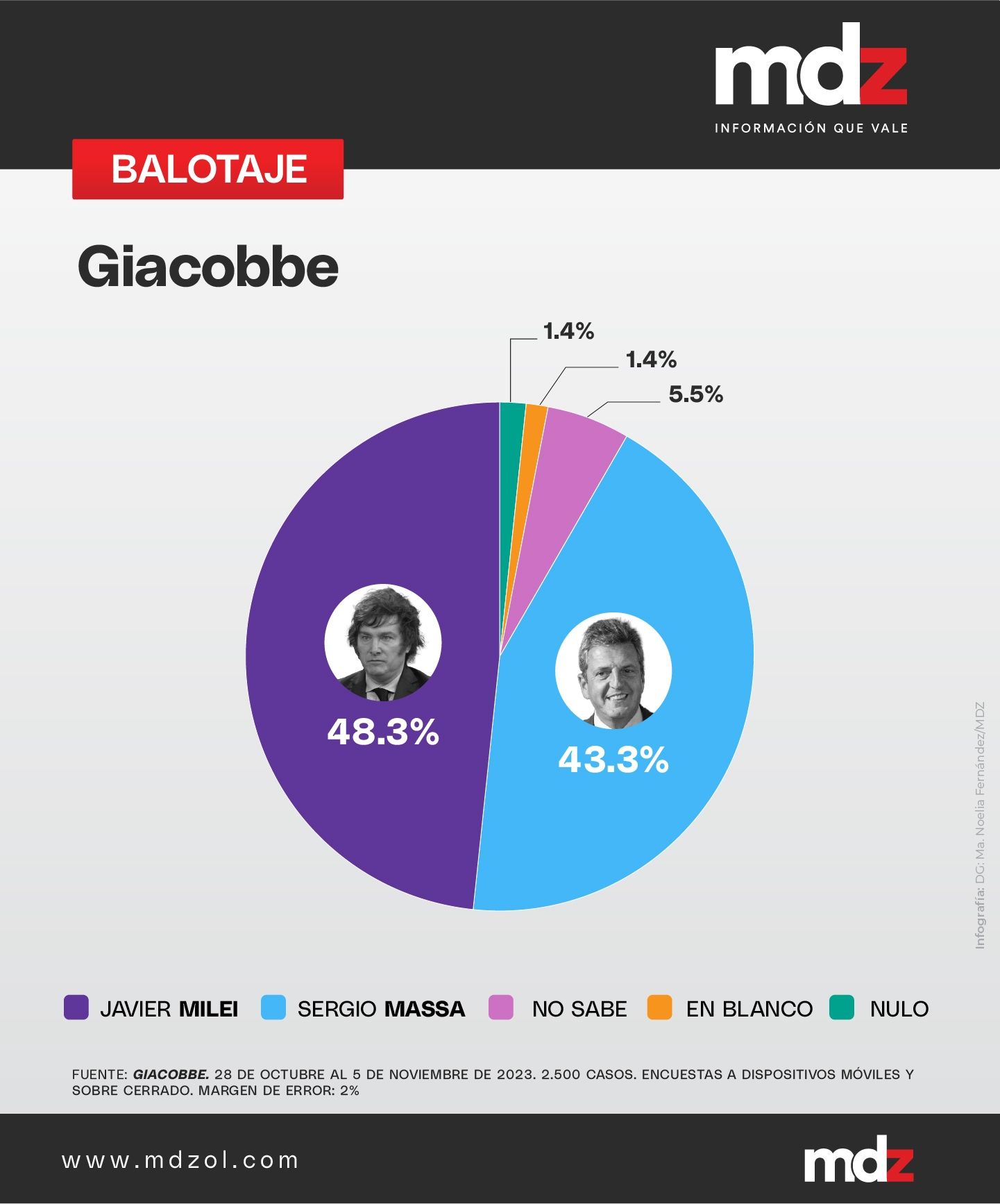 La encuestadora dirigida por Jorge Daniel Giacobbe vaticinó que en un 48,3% sería Javier Milei el encargado de llevar adelante el país desde el 10 de diciembre, mientras que por 5 puntos porcentuales, con el 43,3%, Sergio Massa quedaría en segundo lugar. El 5,5% aún sigue indeciso y el 2,8%votaría en blanco o impugnaría.