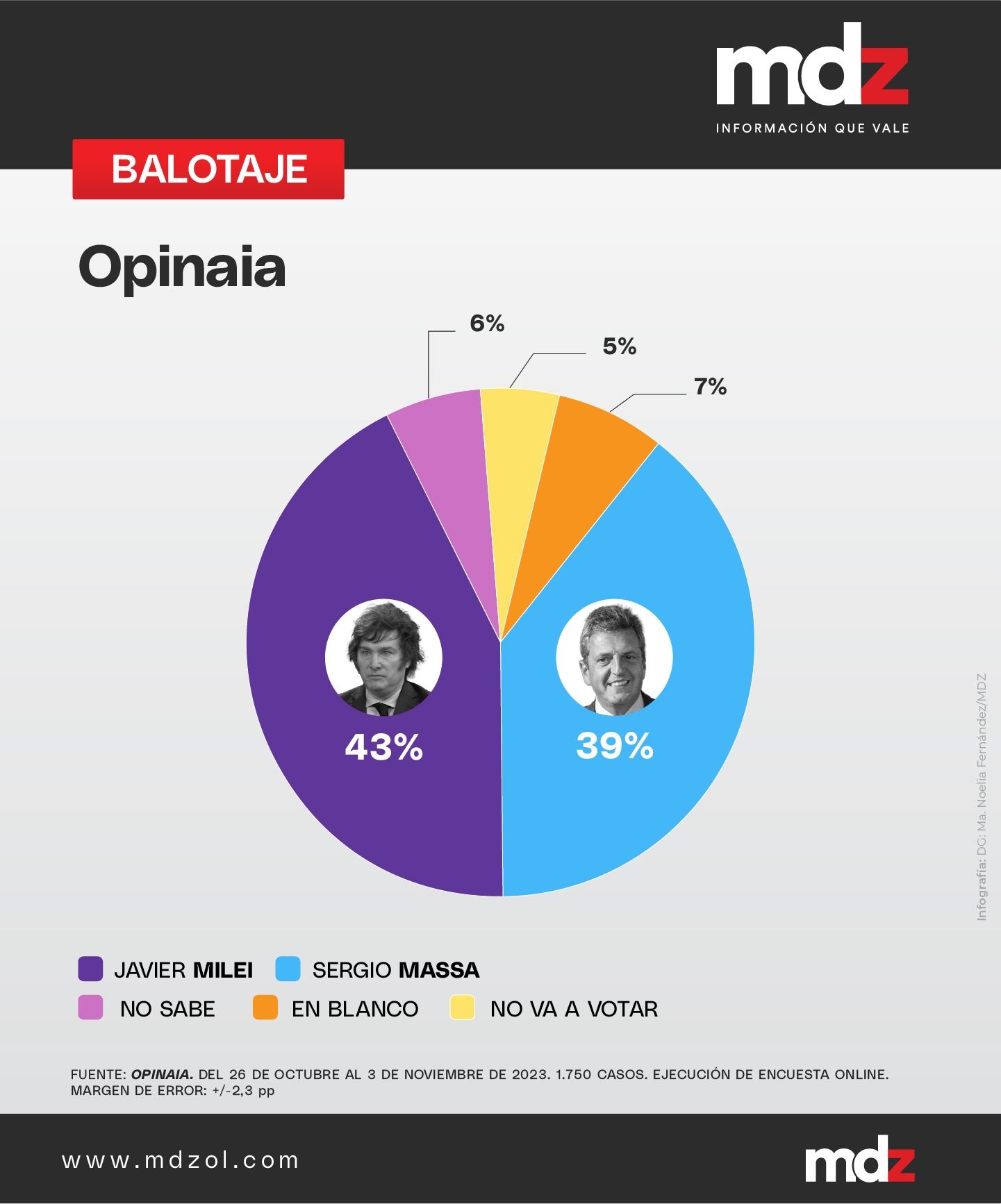 En esta ocasión, MDZ volvió a recabar la información de las encuestadoras más importantes del país. Recordando que muchos votantes definen su elección a días del balotaje o, incluso, otros lo hacen en el propio cuarto oscuro y con más similitudes que diferencias, la gran mayoría de las encuestas revelan que sería Javier Milei el vencedor del balotaje, mientras que las que vaticinan al ministro de Economía como el próximo presidente de la Nación, son la minoría.