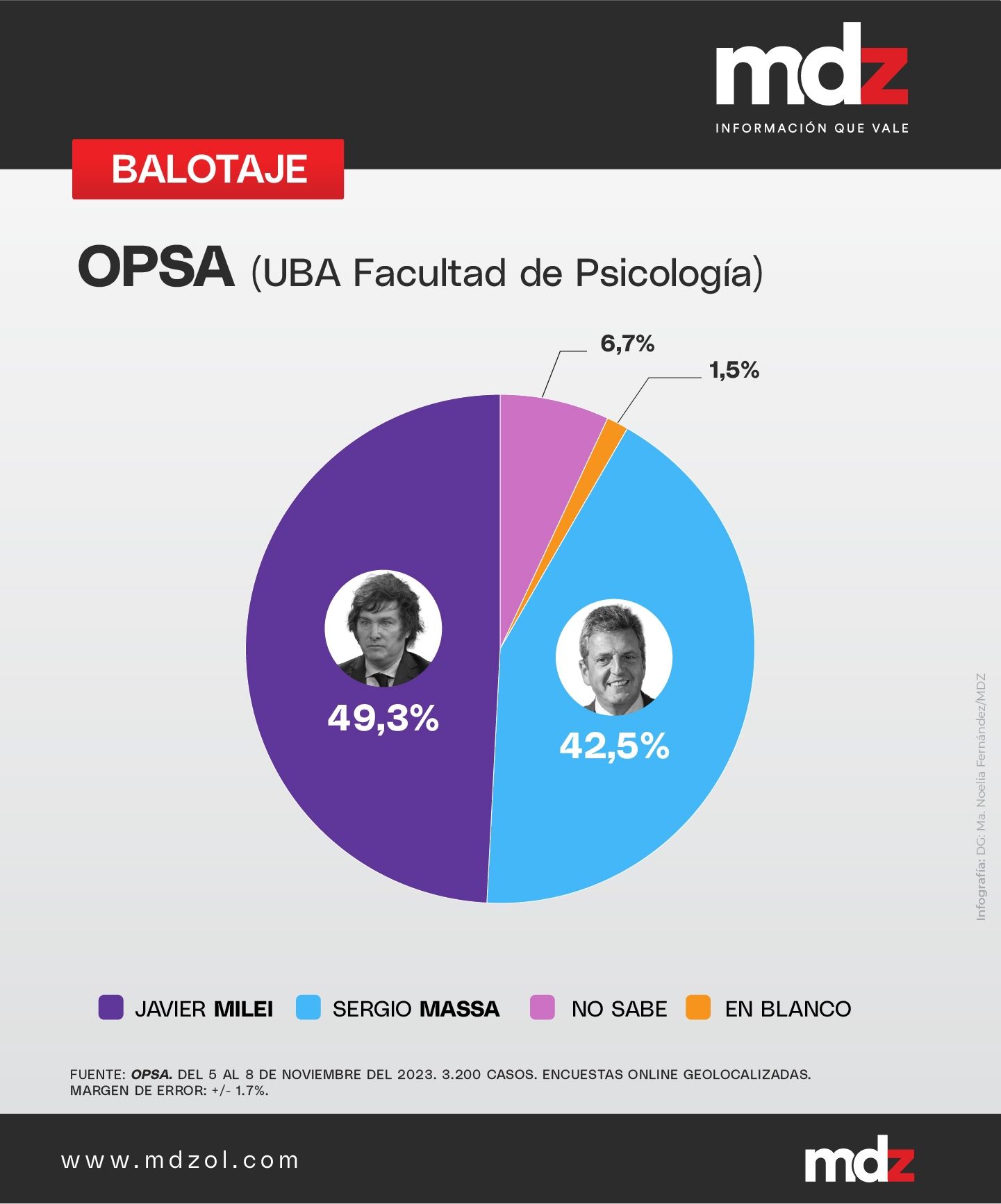 El Observatorio de Psicología Social Aplicada (OPSA) de la UBA vaticinó un número con una amplia diferencia entre los dos candidatos, siendo esta de 6,8 puntos porcentuales. En este caso, nuevamente aparece el libertario en el primer puesto, con un 49,3%. Por su parte, el candidato de Unión por la Patria obtendría el 42,5% de los votos.