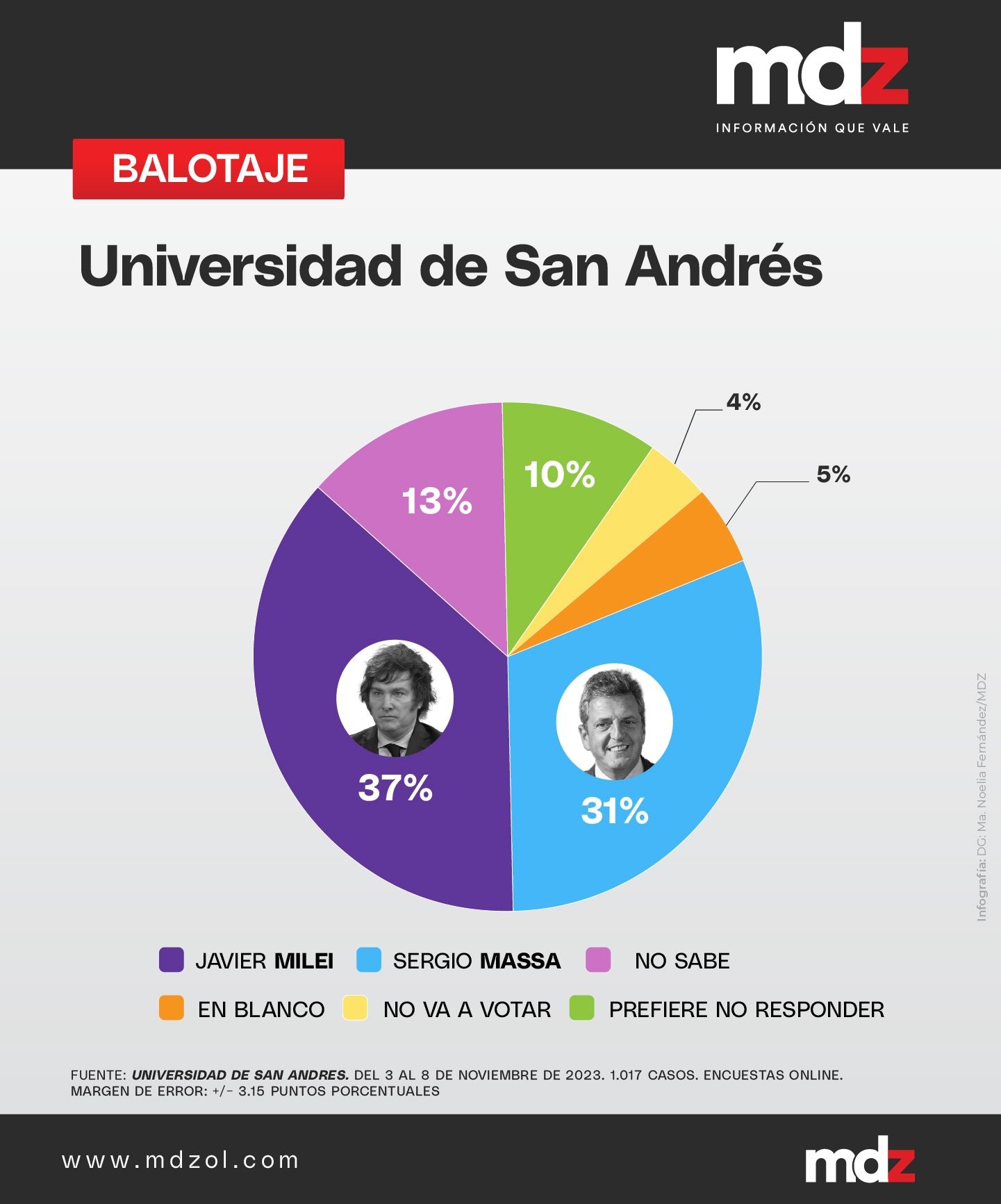 Con eso en cuenta, nuevamente el candidato de La Libertad Avanza aparece como el vencedor de las elecciones con el 37% de los votos a su favor, mientras que Massa recaudaría apenas el 31%.