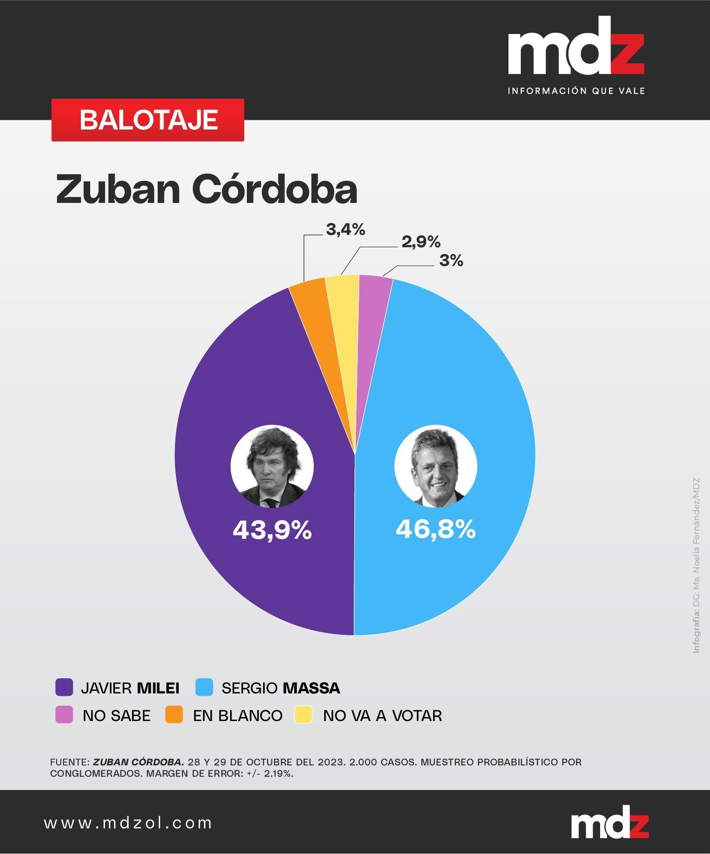 Zuban Córdoba es una de las pocas encuestadoras en las que sus investigaciones dieron como resultado que Sergio Massa sería quien sea el próximo presidente de la Argentina con el 46,8% de los votos; mientras que el candidato de La Libertad Avanza obtendría el 43,9%. En este caso, sería el 3,4% de los votantes que no se inclinaría por ninguno de los candidatos; el 2,9% no iría a votar; y el 3% no sabe.