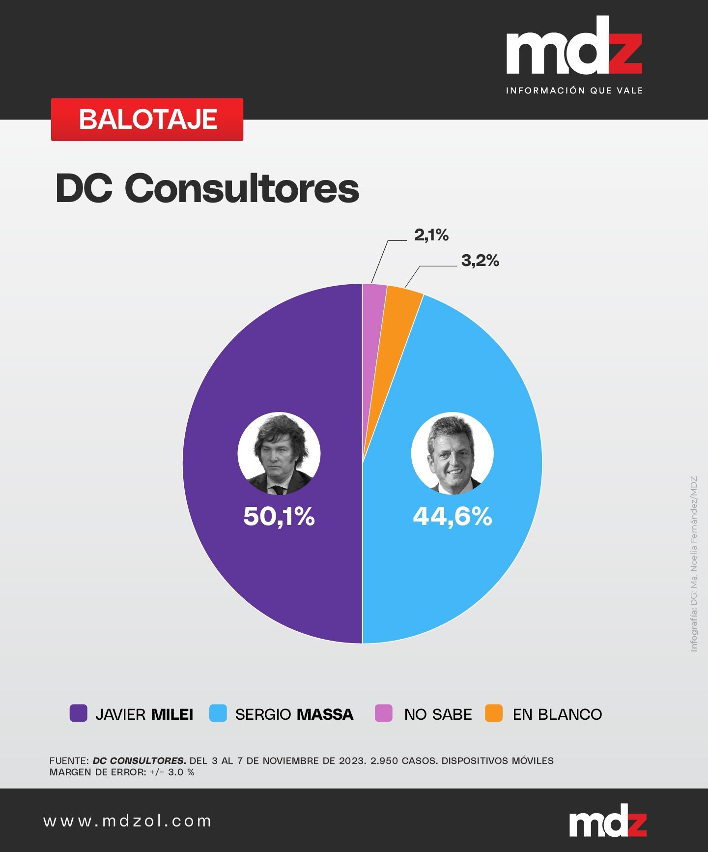 Los números que revela DC Consultores son los únicos en donde Javier Milei cruza la barrera del 50, llegando a obtener el 50,1%. En consecuencia, Sergio Massa obtendría el 44,6% de los votos. El 2,1% aún no habría decidido el voto, mientras que el 3,2% ya definió que votaría en blanco.