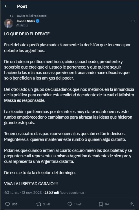 "En el debate quedó plasmada claramente la decisión que tenemos por delante los argentinos", aseveró Javier Milei a través de la red social X (antes Twitter). "Tenemos cuatro días para convencer a los que aún están indecisos. Pregúnteles si quieren mantener este rumbo o quieren algo distinto. Pídanles que cuando entren al cuarto oscuro miren las dos boletas y se pregunten cuál representa la misma Argentina decadente de siempre y cual representa una Argentina distinta", sostuvo Milei en su mensaje.