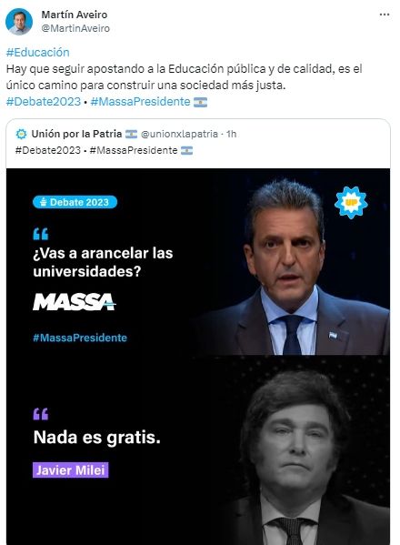 Una vez finalizado el debate electoral entre Sergio Massa y Javier Milei, el peronismo mendocino se pronunció en las redes sociales y salió a respaldar al candidato de Unión por la Patria, a una semana de que se realice el balotaje y, en consecuencia, se defina quién será el próximo presidente de la Argentina.