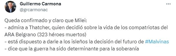 Guillermo Carmona, secretario de Malvinas, Antártida y Atlántico Sur en la Cancillería Argentina, esgrimió: "Queda confirmado y claro que Milei: admira a Thatcher, quien decidió sobre la vida de los compatriotas del ARA Belgrano (323 héroes muertos), está dispuesto a darle a los isleños la decisión del futuro de #Malvinas y dice que la guerra ha sido determinante para la soberanía".