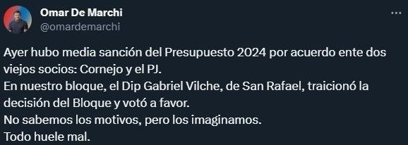 “Ayer hubo media sanción del Presupuesto 2024 por acuerdo entre dos viejos socios: Cornejo y el PJ. En nuestro bloque, el Dip Gabriel Vilche, de San Rafael, traicionó la decisión del Bloque y votó a favor. No sabemos los motivos, pero los imaginamos. Todo huele mal”, expresó en la red social X (ex Twitter) el diputado nacional del PRO.