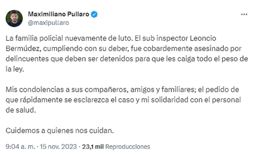 Más temprano, a través de las redes sociales, el gobernador electo exclamó: "cuidemos a quienes nos cuidan" y se solidarizó con la familia del policía asesinado en Rosario.