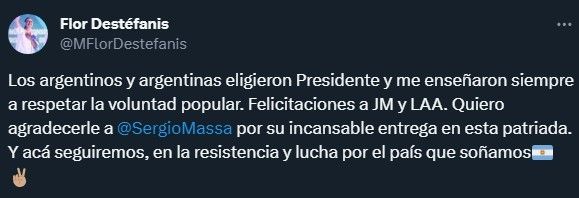 La jefa comunal de Santa Rosa se refirió al presidente electo solo con las siglas de su nombre y agradeció al candidato presidencial del peronismo que resultó derrotado este domingo. “Felicitaciones a JM y LAA. Quiero agradecerle a Sergio Massa por su incansable entrega en esta patriada. Y acá seguiremos, en la resistencia y lucha por el país que soñamos”, señaló.