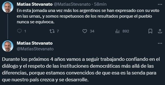 El intendente de Maipú, Matías Stevanato, fue otro de los referentes locales que salió a manifestarse tras el resultado del balotaje. “En esta jornada una vez más los argentinos se han expresado con su voto en las urnas, y somos respetuosos de los resultados porque el pueblo nunca se equivoca”, expresó.
