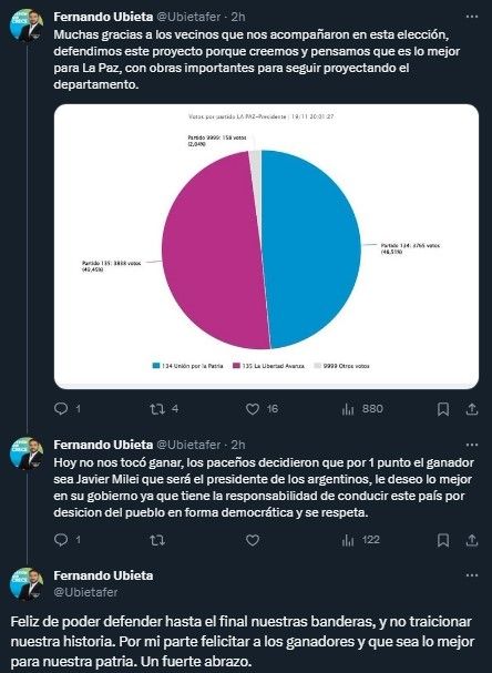 “Muchas gracias a los vecinos que nos acompañaron en esta elección, defendimos este proyecto porque creemos y pensamos que es lo mejor para La Paz, con obras importantes para seguir proyectando el departamento. Hoy no nos tocó ganar, los paceños decidieron que por 1 punto el ganador sea Javier Milei que será el presidente de los argentinos, le deseo lo mejor en su gobierno ya que tiene la responsabilidad de conducir este país por decisión del pueblo en forma democrática y se respeta”, señaló.