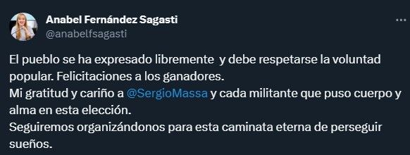 Por parte, cerca de las 11 de la noche también se expresó en las redes sociales Anabel Fernández Sagasti, senadora nacional del Frente de Todos y principal referente de La Cámpora en la provincia. “El pueblo se ha expresado libremente y debe respetarse la voluntad popular. Felicitaciones a los ganadores. Mi gratitud y cariño a Sergio Massa y cada militante que puso cuerpo y alma en esta elección. Seguiremos organizándonos para esta caminata eterna de perseguir sueños”, manifestó la dirigente kirchnerista.