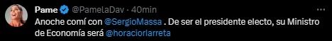 Es que durante la mañana, en la cuenta oficial de X de Pamela David fue publicado un mensaje en el que la conductora admitía haber cenado con Massa y nombraba al jefe de Gobierno porteño como futuro ministro de Economía del candidato.