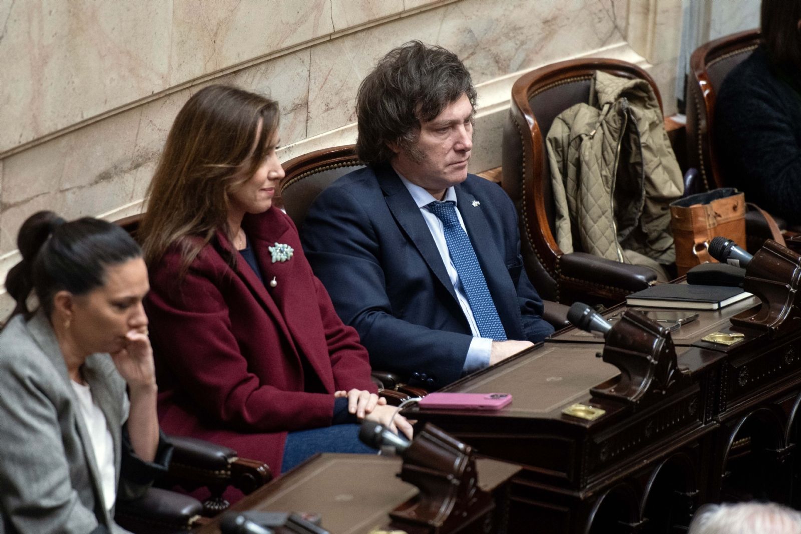 Massa llegó, siguió la breve sesión desde el palco central del recinto de Diputados. Allí estuvo sólo. Se ubicó justo por encima de Javier Milei, en lo que será recordado como una de las fotos de la jornada de hoy. El tigrense aprovechó para saludar a los diputados de su bloque desde el palco y después se reunió con los diputados de su bloque en el despacho de la Presidencia de la Cámara en el primer piso del Palacio Legislativo.
