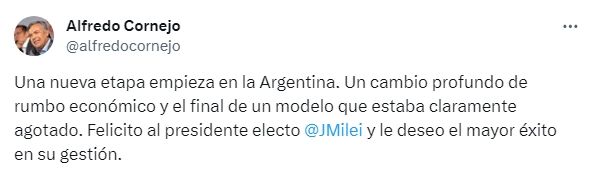 Cornejo nunca expresó en público su apoyo a Milei y prefirió la neutralidad, aunque este domingo felicitó al presidente electo al destacar: "Una nueva etapa empieza en la Argentina. Un cambio profundo de rumbo económico y el final de un modelo que estaba claramente agotado. Felicito al presidente electo Javier Milei y le deseo el mayor éxito en su gestión".