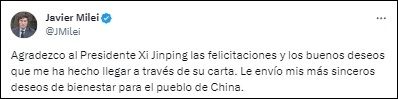 “Agradezco al Presidente Xi Jinping las felicitaciones y los buenos deseos que me ha hecho llegar a través de su carta. Le envío mis más sinceros deseos de bienestar para el pueblo de China”, posteó Milei en su cuenta de X (ex Twitter).