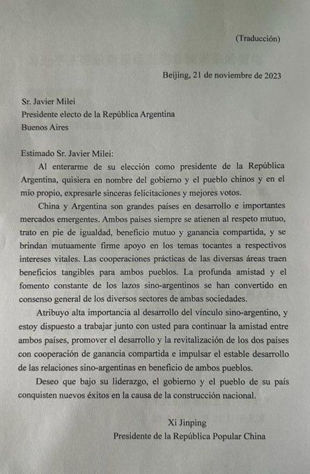 Y, a pesar de los rumores que corrieron durante la campaña de que Argentina rompería relaciones con China y Brasil, el presidente electo compartió esta noche una carta que recibió por parte del mandatario chino, Xi Jinping.