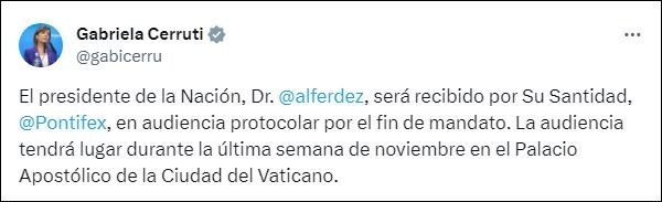 La portavoz presidencial Gabriela Cerruti confirmó la visita a través de la publicación de un escueto comunicado de prensa que publicó en su cuenta de X, ex Twitter.