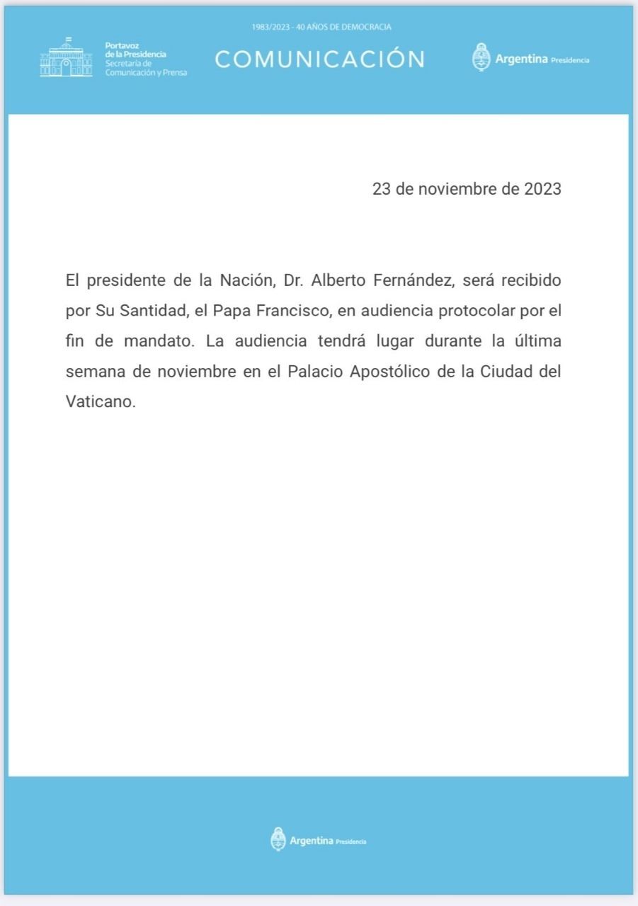 La visita del mandatario saliente tendrá lugar en el Palacio Apostólico y completa la tercera de una serie de encuentros protagonizados por Alberto Fernández. En enero del 2020, tras asumir, el Presidente se entrevistó por primera vez con Jorge Bergoglio y lo propio hizo en mayo de 2021.