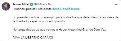 "¡Muchas gracias Presidente Donald Trump! Su presidencia fue un ejemplo para todos los que defendemos las ideas de la libertad y espero conocerlo pronto", escribió Milei en su cuenta de la red social X.