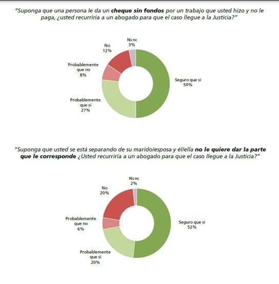 Esto se ve reflejado, por ejemplo, al ser consultados sobre si recurrirían a un abogado para llevar un caso sobre un cheque sin fondos a la Justicia: 5 de cada 10 dijo “seguro que sí”, mientras que el 27% respondió que “probablemente que sí”.