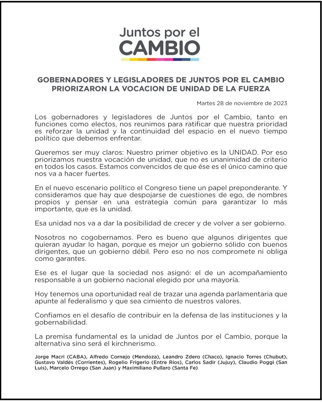 Este martes hubo una reunión clave de la que participaron gobernadores y legisladores nacionales de Juntos por el Cambio con el objetivo de analizar el camino a seguir frente al futuro gobierno de Javier Milei, además de ratificar la unidad del espacio, que sufre una grave crisis interna.