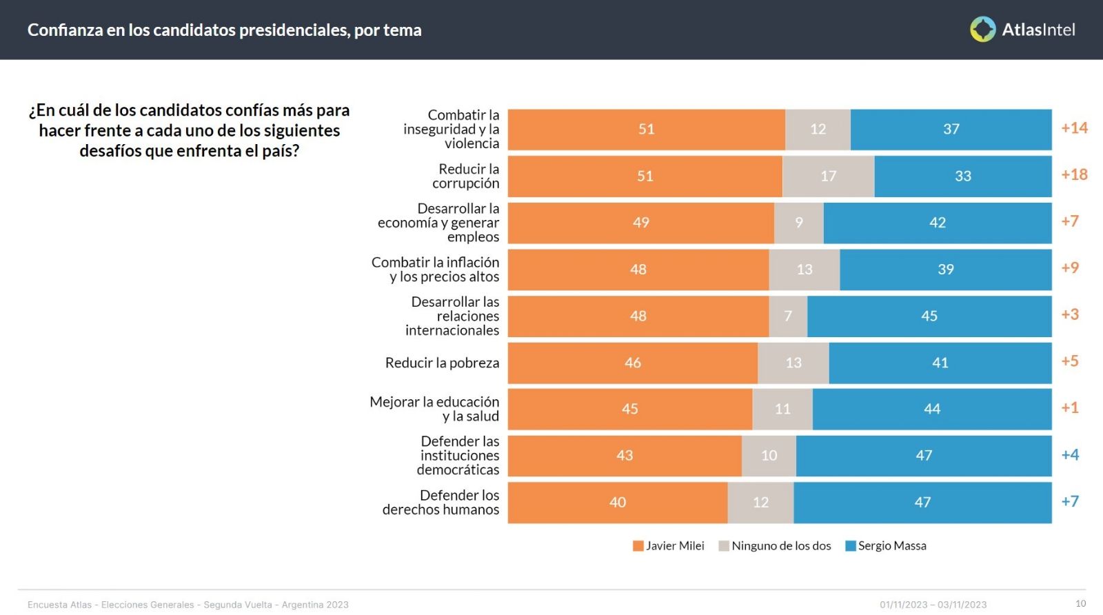 AtlasIntel realizó un sondeo entre 3.218 personas, con un error de +/- 2 puntos porcentuales. La encuesta se realizó entre el 01/11 y el 03/11.