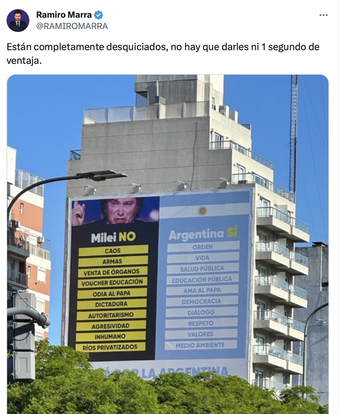 "Están completamente desquiciados, no hay que darles ni un segundo de ventaja", escribió el dirigente de La Libertad Avanza vía X, sumado a la foto en donde se ve una marquesina dividida en dos. Por un lado dice "Milei NO" y enumera las supuestas características que tendría el eventual gobierno del economista. "Caos, armas, venta de órganos, voucher de educación, odio al Papa, dictadura, autoritarismo, agresividad, inhumano, ríos privatizados", escribe.