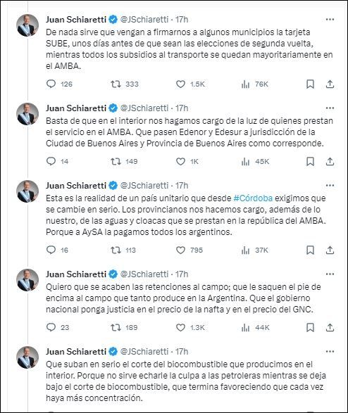 Y continuó: "En #Córdoba cuidamos a nuestra gente, estamos a disposición de las familias y siempre estaremos planteando la necesidad de que en nuestra Patria argentina haya federalismo. Y esto no tiene que ver con las posiciones políticas, tiene que ver con queremos un país equitativo y de nada sirve que vengan a firmarnos a algunos municipios la tarjeta SUBE, unos días antes de que sean las elecciones de segunda vuelta, mientras todos los subsidios al transporte se quedan mayoritariamente en el AMBA", dijo Schiaretti remontando sus banderas de federalismo que habían sido eje de su campaña presidencial.