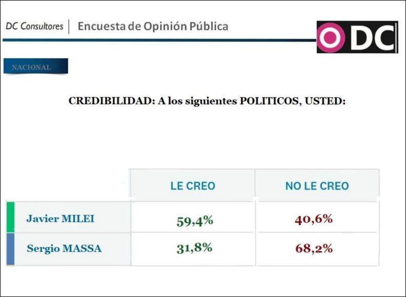 La primera pregunta clave fue relacionada a la credebilidad de los políticos. Puntualmente, se les consultó a los encuestados si le creen o no a los candidatos. En el caso de Javier Milei, el 59,4% respondió que le cree, contra un 40,6% que no le cree, mientras que a Sergio Massa solo el 31,8% le cree y el 68,2% restante no.