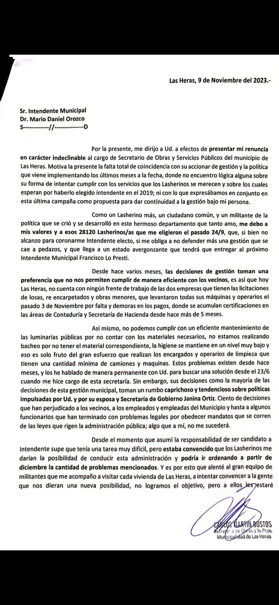 Con un extenso texto que publicó en la red social X, el excandidato a intendente de Las Heras Martín Bustos, renunció a su cargo de secretario de Obras Públicas de Daniel Orozco (La Unión Mendocina) a un mes de terminar la gestión. En el texto que tiene siete largos párrafos, advirtió a Orozco que todo "tiene un límite" y anunció su dimisión.