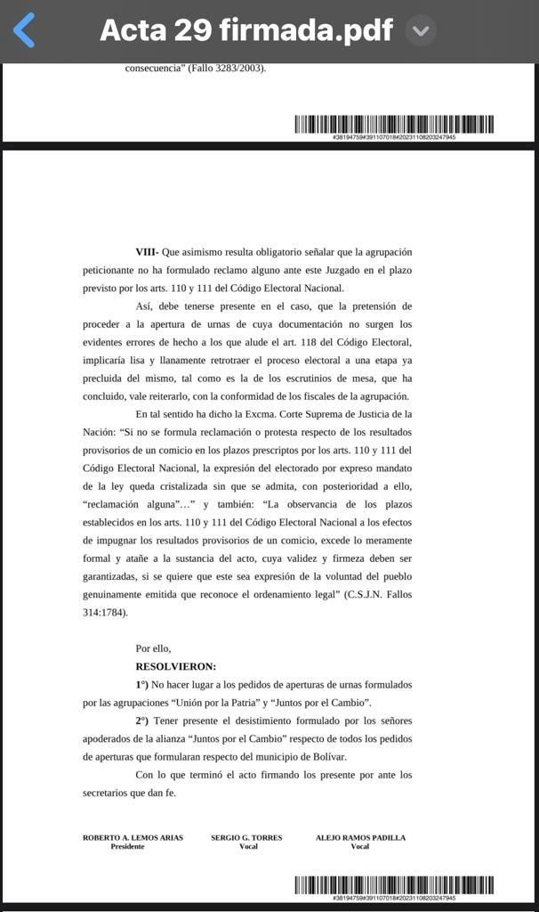 La resolución que se dio a conocer pasadas las 21.30Hs determinó que los pedidos de apertura de urnas realizados por los apoderados de Unión por la Patria y Juntos por el Cambio, fueron solicitados fuera de los plazos establecidos en los artículos 110 y 111 del Código Electoral Nacional.