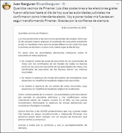 Con la finalización del escrutinio definitivo de las elecciones del 22 octubre, la Junta Electoral determinó que por 19 votos (en la tarde del miércoles el peronismo logró recuperar un voto) Juan Ibarguren, candidato de Juntos por el Cambio, es el intendente electo de Pinamar; que Ramiro Eguen, también de Juntos por el Cambio, le ganó al peronismo el municipio de 25 de Mayo y que en General Alvear fue relecto el intendente radical Ramon Capra.
