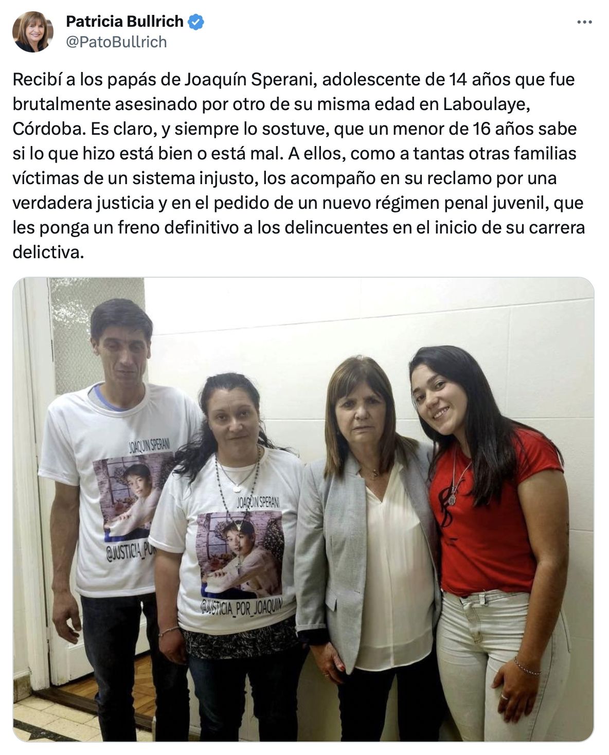 "A ellos, como a tantas otras familias víctimas de un sistema injusto, los acompaño en su reclamo por una verdadera justicia y en el pedido de un nuevo régimen penal juvenil, que les ponga un freno definitivo a los delincuentes en el inicio de su carrera delictiva", concluyó Bullrich. El posteo vino acompañado de una foto de ella con los padres de la víctima.