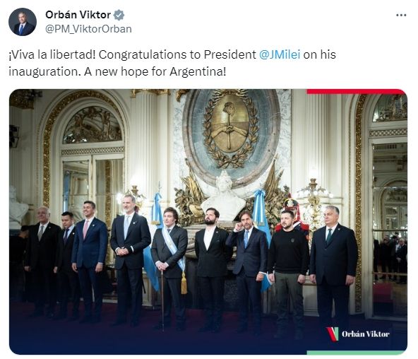 Además de Zelenski, quien llegó al país esta madrugada mientras su nación se mantiene en guerra con Rusia, otro de los europeos que dijo presente fue el primer ministro húngaro, Viktor Orban, quien habló de "una nueva esperanza para América Latina". "¡Una nueva esperanza para América Latina! Felicité al presidente Javier Milei hoy por su aplastante victoria en las elecciones presidenciales en Argentina. ¡Gracias por la invitación!", escribió Orban en su cuenta oficial de X.