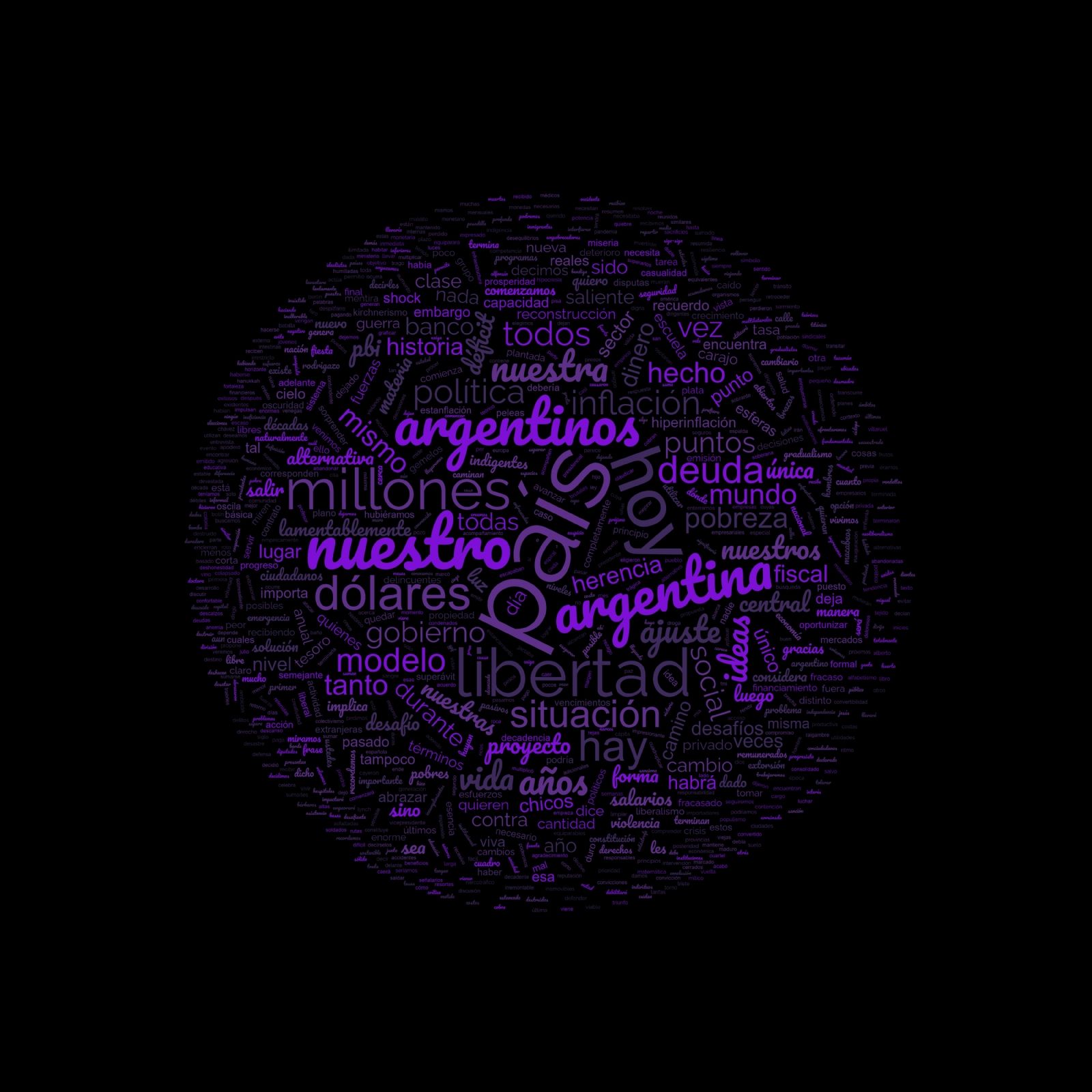 Las palabras que más repitió Javier Milei en su discurso fueron "país" (23 veces), "hoy" (15 veces), "libertad" y "nuestro" (14 veces cada uno), "Argentina", "argentinos" y "millones" (12 veces cada una) y "dólares" (10 veces).