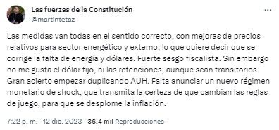 "Las medidas van todas en el sentido correcto, con mejoras de precios relativos para sector energético y externo, lo que quiere decir que se corrige la falta de energía y dólares. Fuerte sesgo fiscalista", empezó destacando Martín Tetaz.
