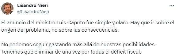 Por su parte, el diputado nacional y miembro del riñón cornejista, Lisandro Nieri posteó en sus redes sociales que "el anuncio del ministro Luis Caputo fue simple y claro. Hay que ir sobre el origen del problema, no sobre las consecuencias. No podemos seguir gastando más allá de nuestras posibilidades. Tenemos que eliminar de una vez por todas el déficit fiscal".