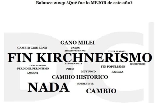 En un modo de conocer el balance del 2023, se preguntó a los participantes qué fue lo mejor de este año. La gran mayoría optó por la opción “fin del kirchnerismo”, seguida de “nada”, "cambio histórico" y "gano Milei".