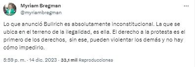 Por último, Myriam Bregman lanzó una catarata de tuits donde tildó el accionar de la ministra como "absolutamente inconstitucional" e incluso lo tildó como "ilegal". Además, acusó al gobierno de impulsar medidas que "constituyen un profundo ataque a las condiciones de vida de millones de personas".