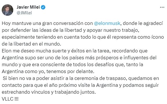 "Mantuve una gran conversación con Elon Musk, donde le agradecí por defender las ideas de la libertad y apoyar nuestro trabajo, especialmente teniendo en cuenta todo lo que él representa como ícono de la libertad en el mundo", comenzó el mensaje que publicó Javier Milei en su cuenta de X. Y agregó: "Elon me deseó mucha suerte y éxitos en la tarea, recordando que Argentina supo ser uno de los países más prósperos e influyentes del mundo y que era consciente de todos los desafíos que, tanto la Argentina como yo, tenemos por delante".
