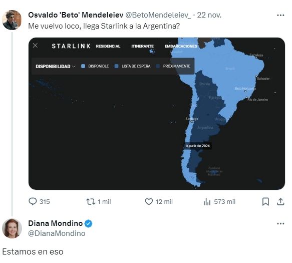 Starlink, la compañía de Musk que ofrece servicio de banda ancha satelital, tiene interés de desembarcar en el país en 2024. La idea de una posible inversión de la empresa extranjera fue adelantada semanas atrás por la canciller Diana Mondino en redes sociales, al responderle el posteo de un usuario de X.
