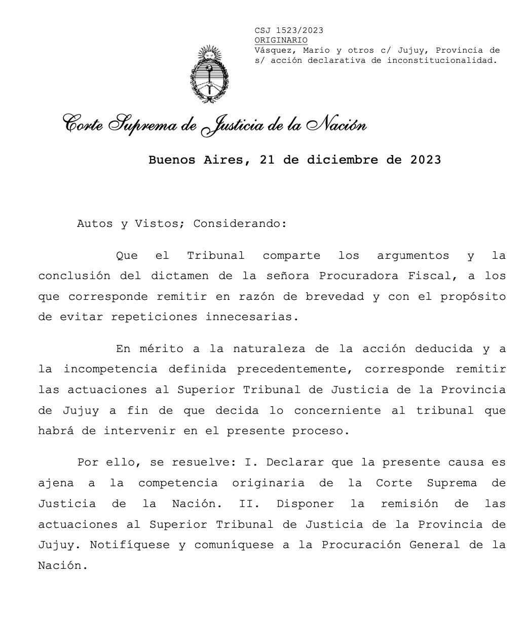 La Corte Suprema de Justicia rechazó tratar dos causas judiciales contra la reforma constitucional de Jujuy por falta de competencia en la causa, la firma de los jueces Horacio Rosatti, Juan Carlos Maqueda, Carlo Rosenkratz y Ricardo Lorenzetti figuran en el dictamen del Procurador General de la Nación y en los argumentos que tuvieron para avalar esa decisión, que no tratara los planteos de organizaciones sociales que creen inconstitucional la reforma y exigen una nulidad.